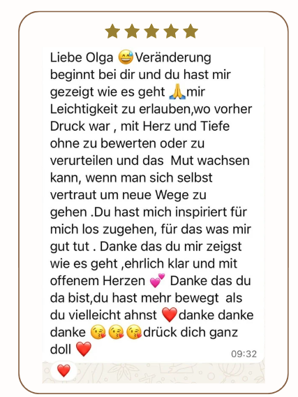 * Das 30-minütuge Gespräch ist für dich kostenlos und unverbindlich. Es dient dazu, dass wir beide spüren, ob wir zusammenpassen – und ob du bereit bist, den nächsten Schritt in Richtung Energie, Leichtigkeit und Strahlen zu gehen.
