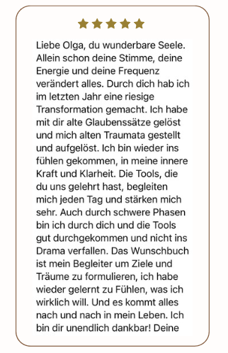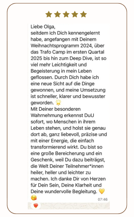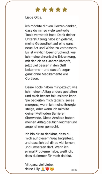 Aber ich wollte mich nicht damit abfinden. Ich wollte mehr – mehr Energie, mehr Strahlen, mehr Sinn. Auf meiner Suche habe ich moderne Energiearbeit, Ayurveda und smarte Gewohnheiten entdeckt. Methoden, die keine endlosen Gespräche brauchen, sondern sofort wirken. Sie haben mir in wenigen Monaten meine Power und Ausstrahlung zurückgegeben und neue Perspektiven eröffnet.